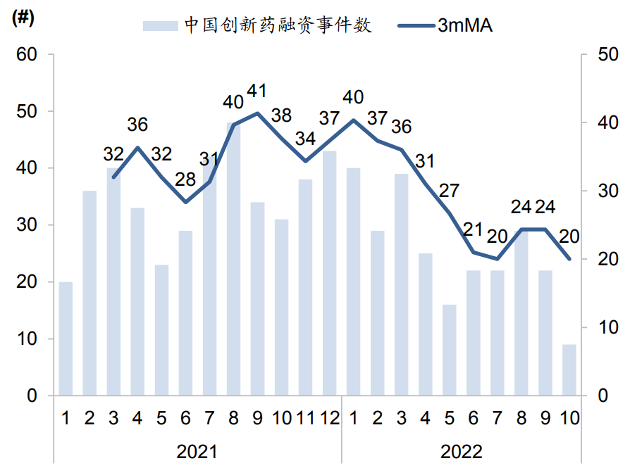 中国创新药投融资在10月份表现疲弱,3mMA(三个月移动均值)同比下降68%,主要由于事件数下降至20起、事件平均融资额下降至2100万美元。全球创新药板块前十大融资事件,中国创新药企连续两月缺席。