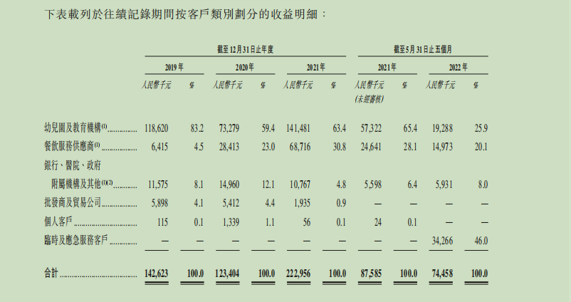 从披露的招股书来看,2022年前五个月,乓乓响来自幼儿园及教育机构、餐饮服务供应商、银行、医院、政府附属机构以及其他的毛利分别为960.1万元、459.5万元、175.5万元,对应的毛利率分别为49.8%、30.7%、29.6%,这三项客户群体的毛利率均大幅低于临时及应急服务供应商的毛利率水平。乓乓响表示,截至2022年5月底,来自幼儿园及教育机构以及餐饮服务供应商的收益大幅减少,该影响部分被提供临时及应急服务的收益所抵销。