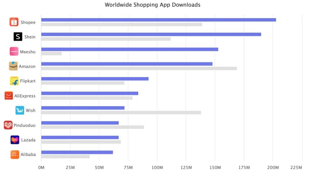 去年5月,Shein的下载量首次超越亚马逊,成为美国安卓和苹果商店里下载量最高的购物应用程序,此后,Shein 几乎都稳居美国购物类应用程序的下载量首位,GMV和下载量增速把亚马逊远远甩在了身后。