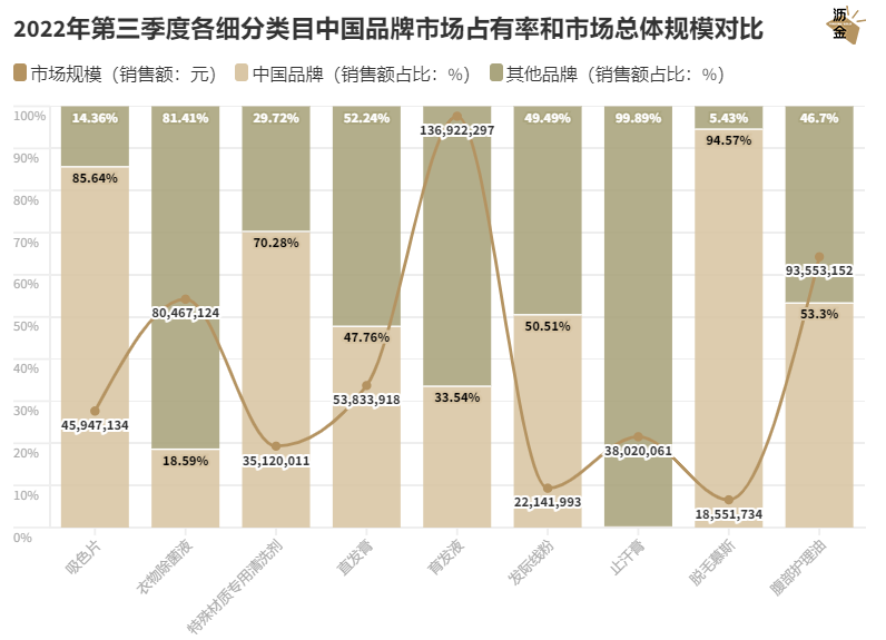 会发现这些小品类的发展遵循一定的结构性规律:国货品牌在市场规模较小的品类中占比较高,在市场规模较大的品类中占比较小。