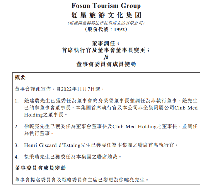 11月7日,复星旅文迎来人事大调整,据复星旅游文化集团(以下简称“复星旅文”)公告,钱建农已请辞公司董事长、首席执行官,徐晓亮获委任为董事会主席、地中海俱乐部集团主席以及调任为执行董事,Henri Giscard d'Estaing获委任为复星旅文联席首席执行官,徐秉璸获委任为联席总裁。![]()