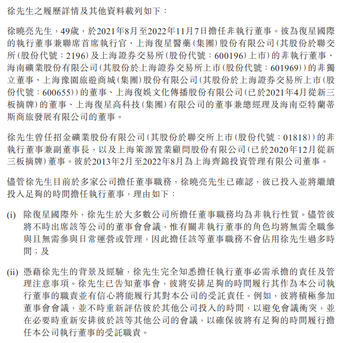 根据公告信息显示,徐晓亮同时也担任复星国际的执行董事兼联席首席执行官、上海复星医药(集团)股份有限公司的非执行董事、海南矿业股份有限公司的非独立董事、上海豫园旅游商城(集团)股份有限公司的董事、上海复娱文化传播股份有限公司的董事、上海复星高科技(集团)有限公司的董事兼总经理及海南亚特兰蒂斯商旅发展有限公司的董事。![]()