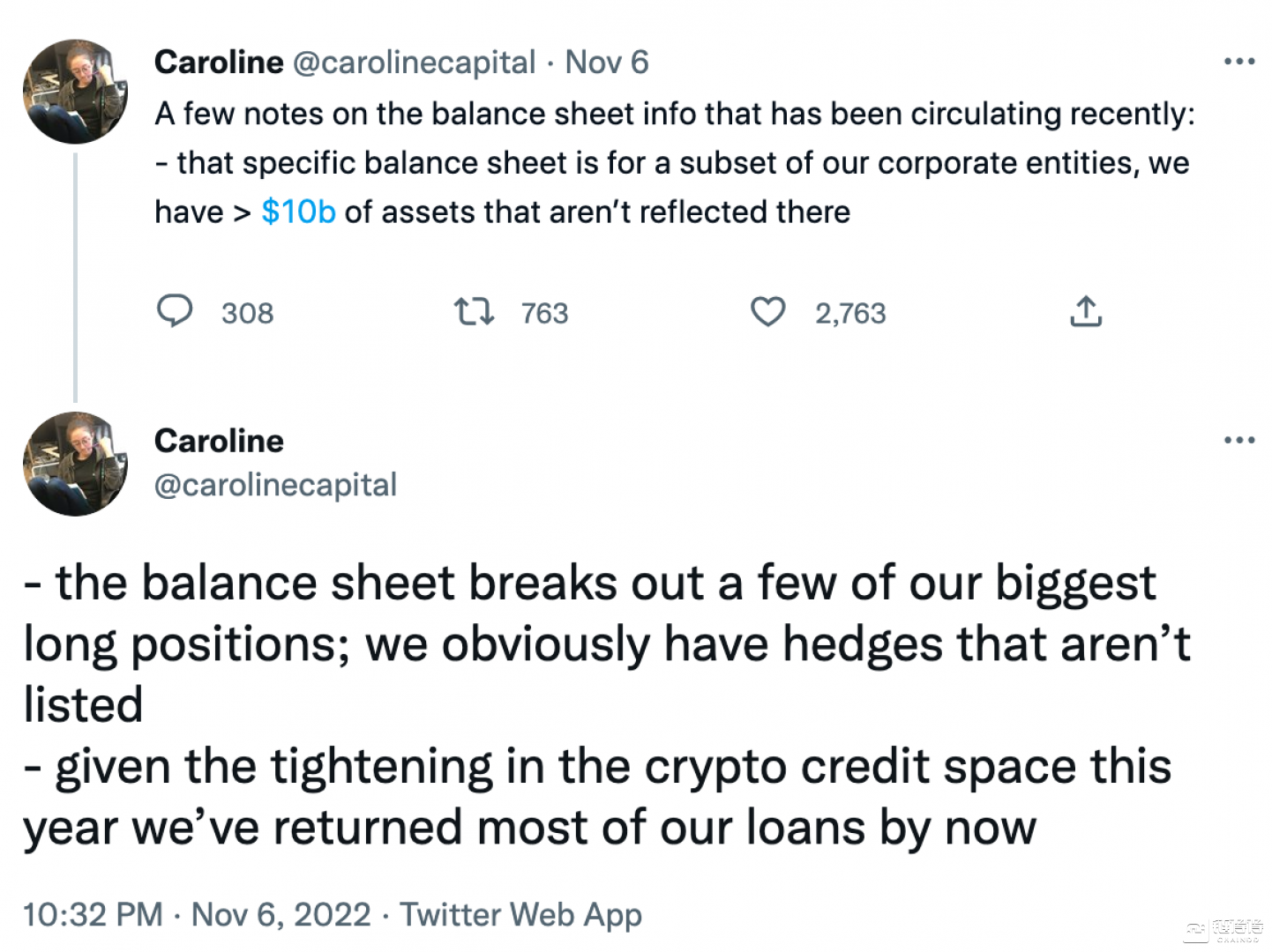 同时,Caroline Ellison还就Alameda Research财务文件一事作出了回应:“网上流传的资产负债表不完整,仅是公司实体的一个子集,我们有超过100亿美元总资产没有反映在该表中。此外,资产负债表列出了我们几个最大的多头头寸,但却没有列出我们的对冲仓位。考虑到今年加密信贷领域的紧缩,目前为止我们已经归还了大部分贷款。”