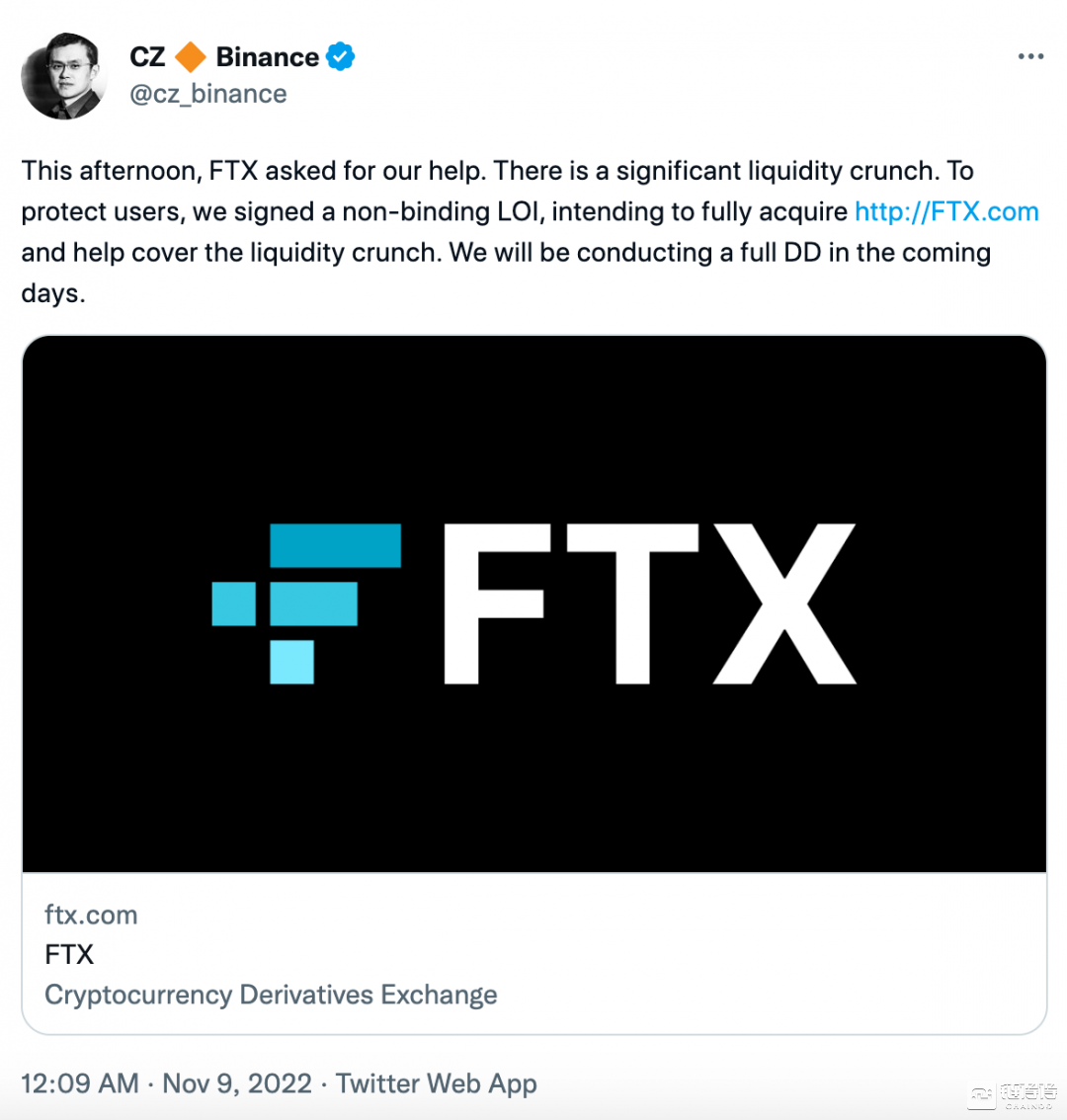 11月9日零点刚过,币安CEO赵长鹏就在推特投下一个重磅炸弹,他表示,“今天下午,FTX向我们寻求帮助。其存在严重的流动性紧缩。为了保护用户,我们签署了一份不具约束力的意向书,打算完全收购FTX并帮助其应对流动性紧缩。我们将在未来几天进行完整的尽职调查。”