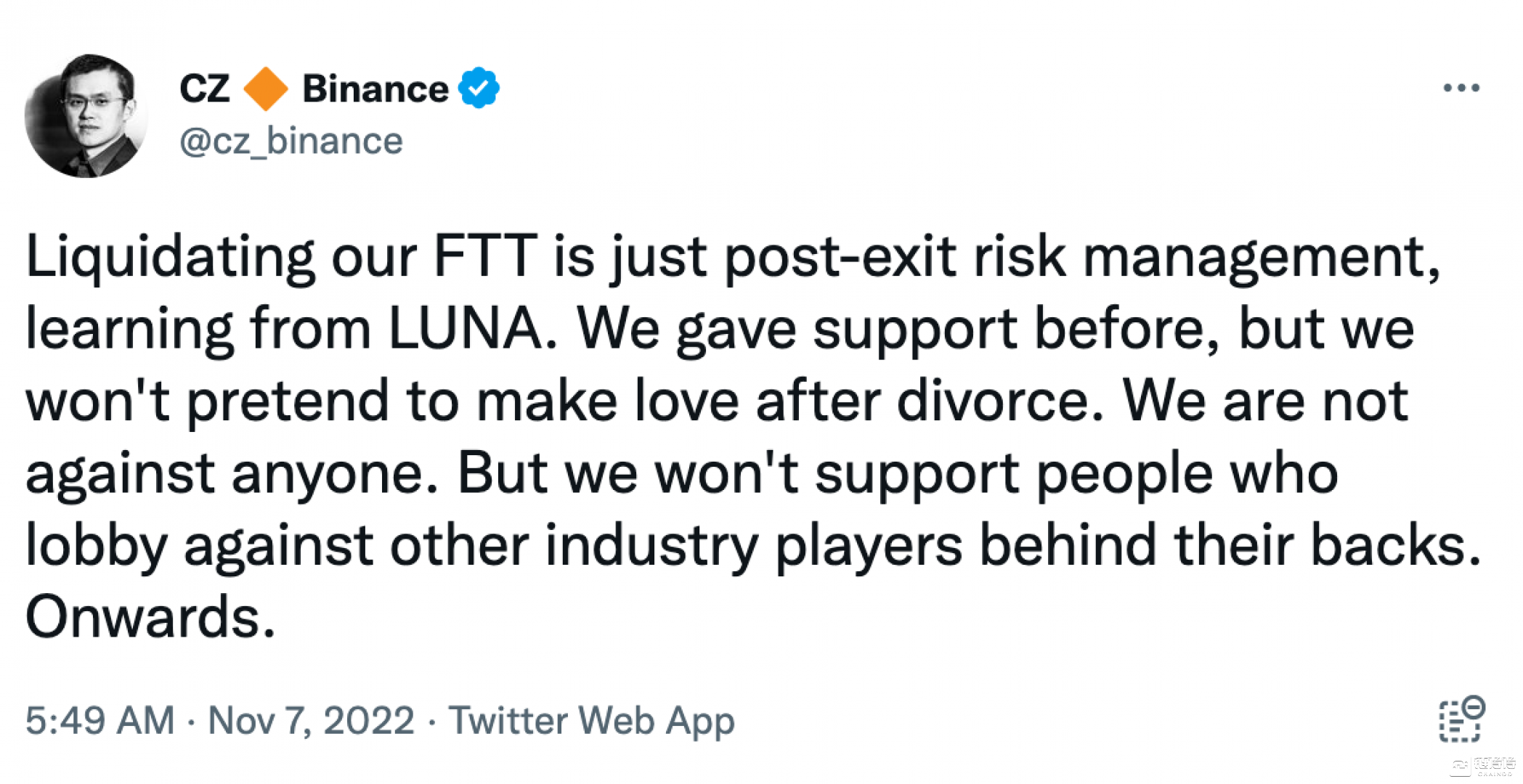 CZ称,“清算FTT只是后期退出的风险管理,也是吸取了此前LUNA的教训。Binance以前支持过,但离婚后不会假装相爱。我们不反对任何人,但不会支持那些在背后游说反对其他行业参与者的人。”