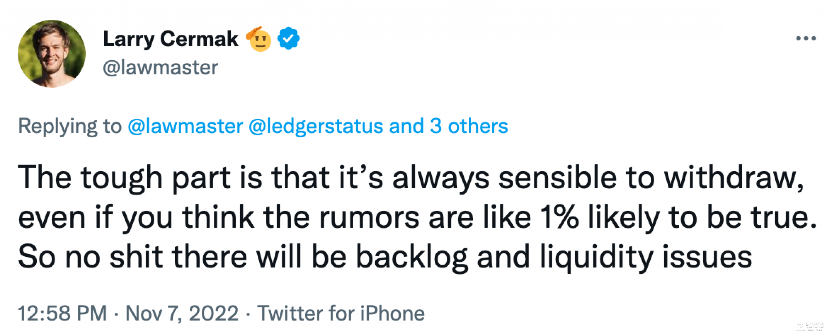 CZ则是将FTX与LUNA进行了对比,再次助燃了之前FUD的情绪。他很清楚,近几个月,许多大公司相继破产,行业参与者们的精神都有些紧张,没人愿意再冒任何的风险。