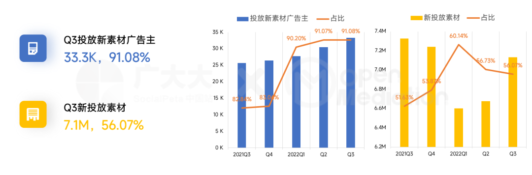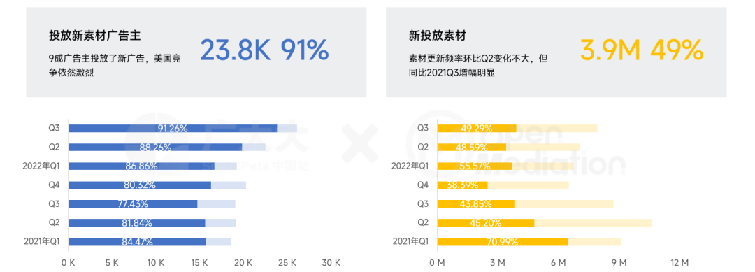 据Statista数据显示,去年美国的互联网普及率就已经达到了91%,这意味着仅有不到一成的居民难以触达,也代表着激烈的存量竞争。比如,投放竞争就异常激烈,Q3仅有9%的广告主没有投放新素材,广告主需要保持高频的素材更新速度,才能保住自己在北美的一席之地。