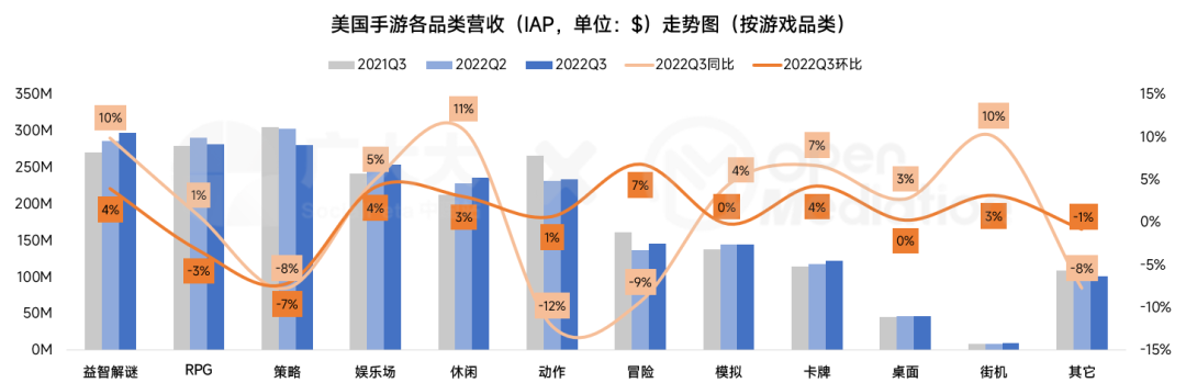 比如今年国内大火的《羊了个羊》就同属于Puzzle中的消除赛道,由于老用户的存量足够大,成功产品提供的市场经验足够丰富,便有机会创造“老树开新花”的佳绩。放在北美市场,《Candy Crush Saga》、《Homescapes》、《Fishdom》便是“常青树”般的存在,通过持续不断的版本迭代和运营活动增强付费用户的粘性,带动整个Puzzle赛道在Q3以4%的季度增速持续快速盈利。