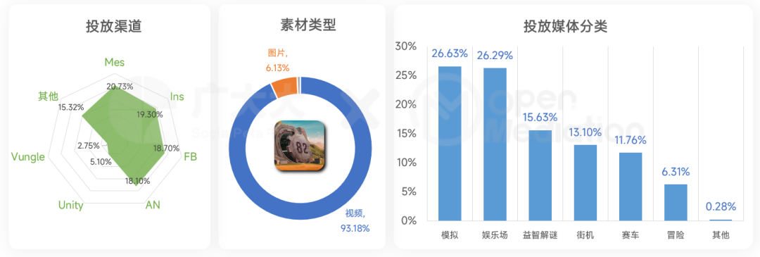 1. Instagram渠道的素材量占比最高,以视频素材为主。