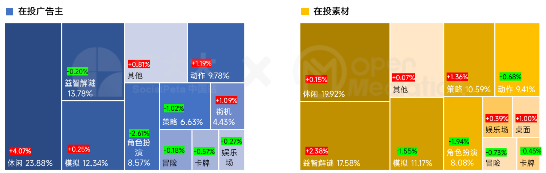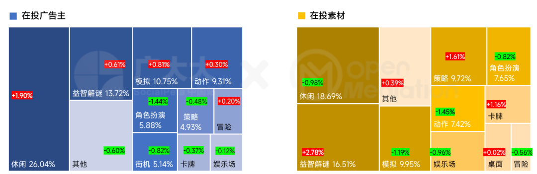 在北美的在投广告主中,益智解谜(Puzzle)是在投素材最多的游戏品类,2022年Q3环比增长2.78%,而这一品类本身就是北美第二大广告投放赛道,这说明在“市场整体下行”的大趋势中,虽然难以寻找增量,但依旧有一些传统赛道可以发力。
