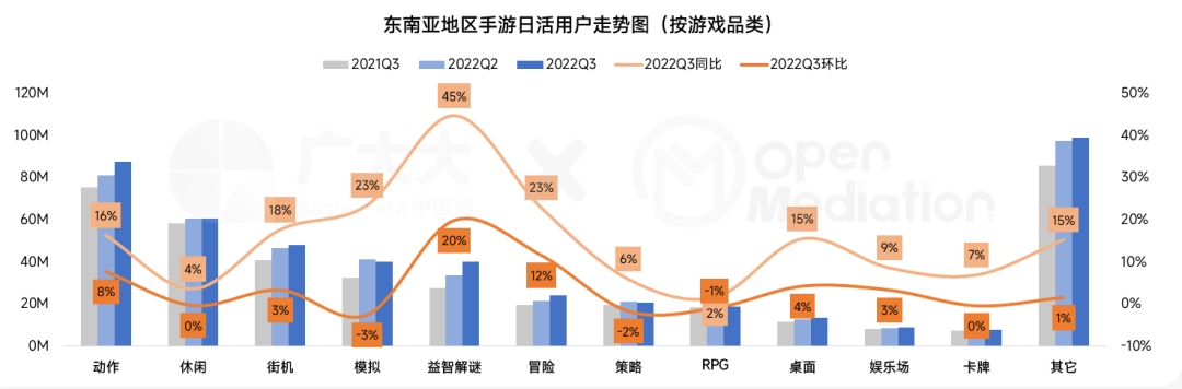 在全球范围内的不同国家/地区出现大规模“减速”的背景下,东南亚始终保持着较为平稳的增长,可以说是当前少见的“增量市场”。Q3东南亚各品类游戏的DAU同比去年全线增长,其中益智解谜的DAU同比上涨45%,环比增长20%,得益于《Save the Doge》在东南亚的快速获客。