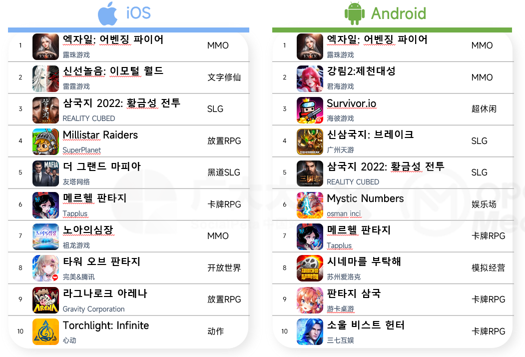 当然,这并不能阻止出海手游的投放力度,Q3有多款知名手游出海韩国开始投放,包括雷霆的《一念逍遥》、完美世界的《幻塔》以及三七互娱的《斗罗大陆》。海彼游戏的割草手游《Survivor.io》也在韩国地区开启了大规模投放,约有27.4%的宣传素材投放到了韩国地区。