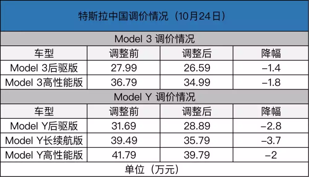 从9月起就影影绰绰传来的特斯拉降价事件正式得到了确认。10月24日,特斯拉宣布大陆地区在售Model3及ModelY售价调整。调整后Model3车型起售价为26.59万元人民币;ModelY车型起售价为28.89万元人民币。