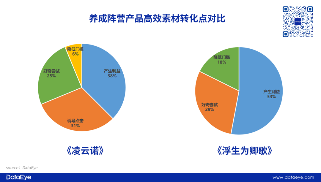 整体来看,这两款产品在吸睛点上希望通过女性角色的视角,以调动用户情绪,期望与目标核心用户共情。因此素材内容均包含“矛盾/对比”,切中用户对现实的不满,满足对自我价值快速实现的需求,例如平民出身完成逆袭等。