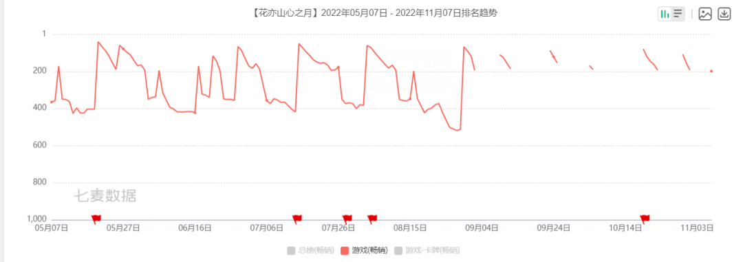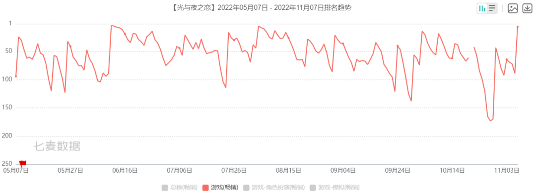 而且,女性向核心玩家一般不是手游的核心群体,多以碎片时间体验游戏为主,所以大多数女性向产品呈现出波动大、不稳定的特点。例如《光与夜之恋》,近半年畅销榜排名波动较大,最高可以进入TOP5,但也会跌至150名开外。《花亦山心之月》同样如此。
