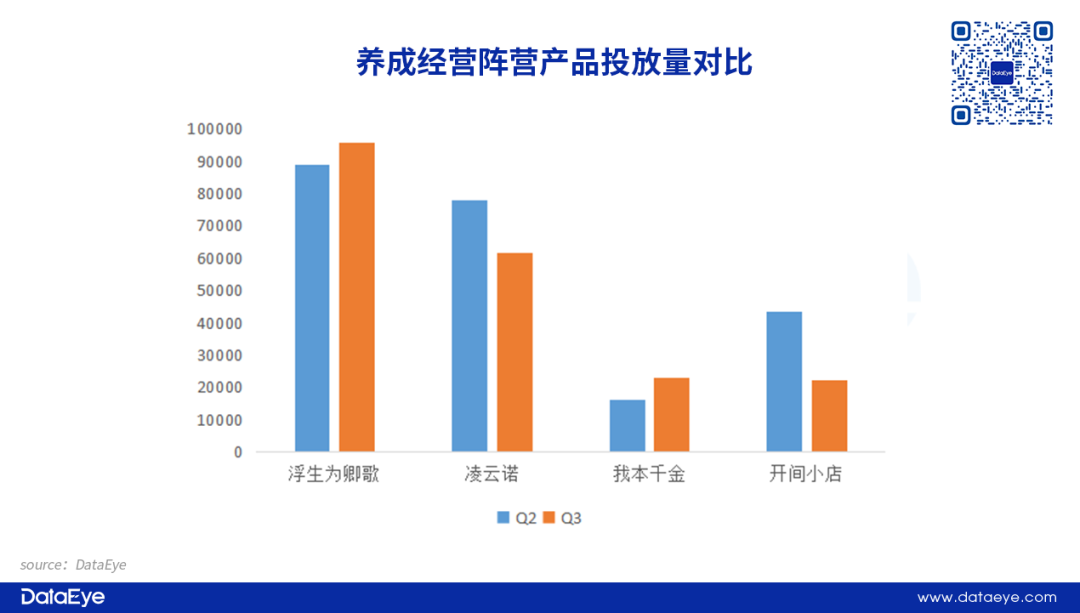 相比于乙女题材,国内养成、经营玩法的女性向在投放市场更加活跃。其中19年发行的《浮生为卿歌》在今年的买量市场上表现突出,《我本千金》Q3投放量也有提升。