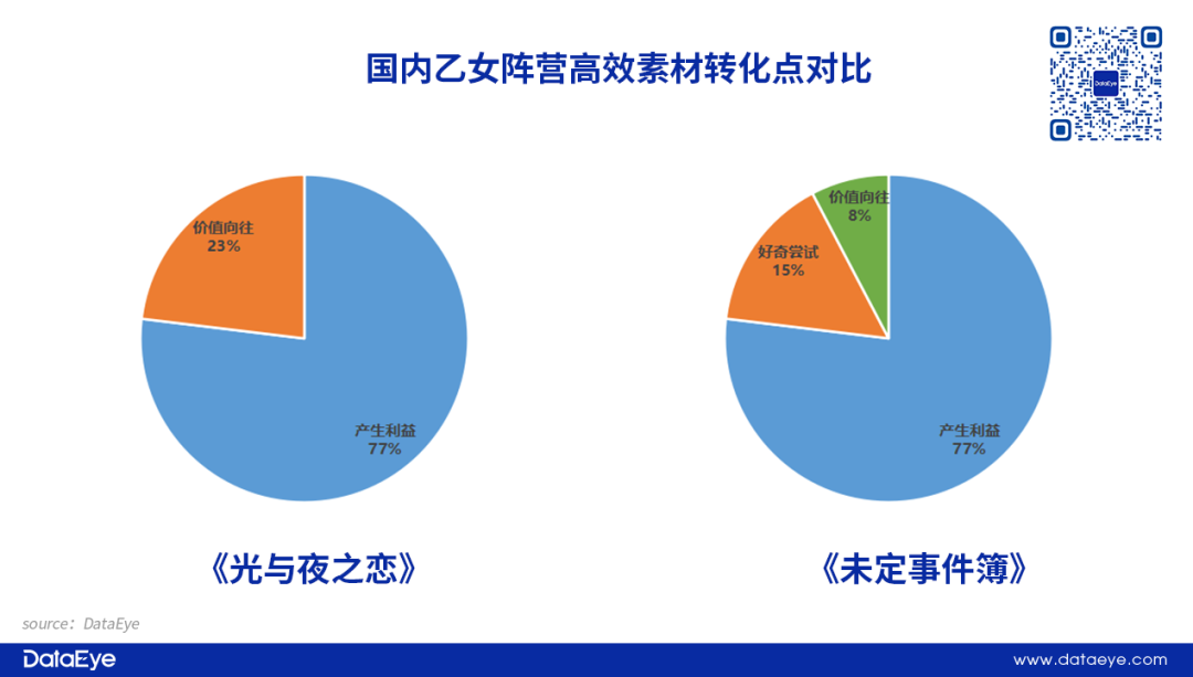 因此,我们发现乙女题材在创意素材上不会设置强势的转化点,而是通过提高品质、用户的价值认同感来转化用户,所以整体素材内容呈现出节奏慢、对话内容多的特点,但这样类型的素材比较“挑”用户,且利弊分明——好处是能够深度转化潜在用户,弊端则是容易审美疲劳,且难以触达泛用户群体。