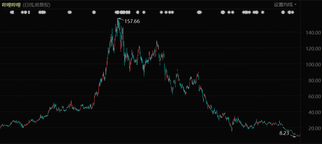 B站股价的持续下滑是从2021年2月底开始的,从巅峰期的每股157.66美元一路跌到如今的每股9.53美元,中间几乎没有过止跌反弹的时候。同年3月登陆港股更是开盘即破发,再也没有了2018年的意气风发。