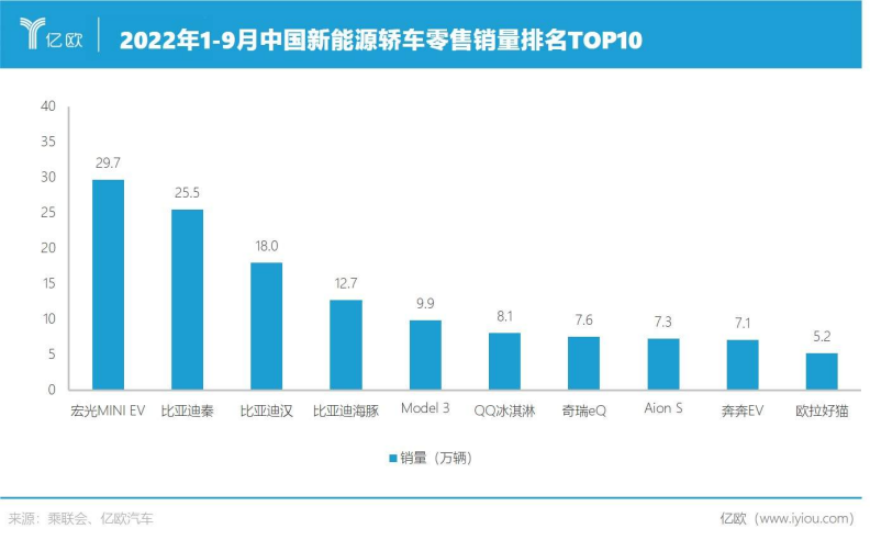 在2022年1-9月中国新能源轿车零售销量排名TOP10中,宏光MINI EV以29.7万辆的销量,排名第一。截止今年9月,宏光MINI EV已经蝉联24个月的中国新能源纯电车型销冠。