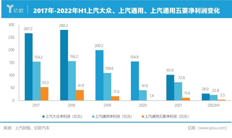 根据上汽财报数据,2022年上半年,上汽通用五菱净利润仅为3.5亿元,远低于上汽通用的22.8亿元和上汽大众的28亿元。