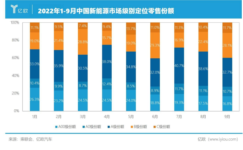 根据乘联会数据,2022年,中国A00级新能源市场份额已从1月的26.3%下降至9月的16.8%,整体呈现下降趋势。中国新能源市场的主力军仍是A级车型。