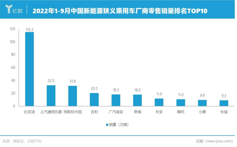 根据乘联会数据,在2022年1-9月中国新能源狭义乘用车厂商零售排名TOP10中,比亚迪以115.3万辆的新能源销量一骑绝尘,位列第一。上汽通用五菱则以32.5万辆的销量超过特斯拉的31.8万辆,排行第二,仅次于比亚迪。