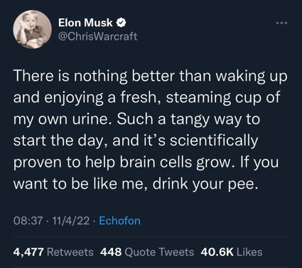但是大规模的混乱和模仿已经到来了,矛头指向马斯克本人。Twitter上的一些已经认证过的大V,开始利用这项特权,将自己假扮成马斯克本人,说着讽刺一些马斯克永的话。这个名单很长,包括演员理查德·萨默(Richard Sommer)、前足球运动员克里斯·克鲁威(Chris Kluew)、漫画家杰夫·亚克(Jeph Jacques)、记者克里斯托弗·胡克斯(Christopher Hooks)、喜剧演员凯西·格里芬(Kathy Griffin)、作家马努·萨蒂亚(Manu Saadia)……