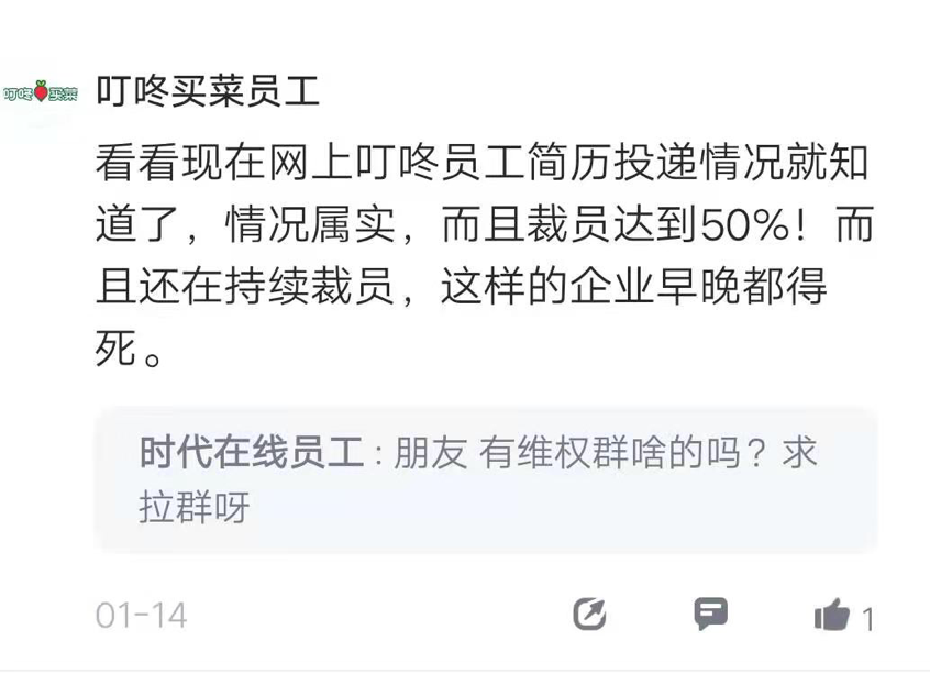 早在年初,就有一位认证为叮咚买菜员工的网友在脉脉平台上透露,叮咚买菜已经开启大裁员,裁员比例为采购50%、算法30%、运营30%、招聘为10%-20%。在离职员工的赔偿方面,有被裁员工表示“没有n+1,只有n”。