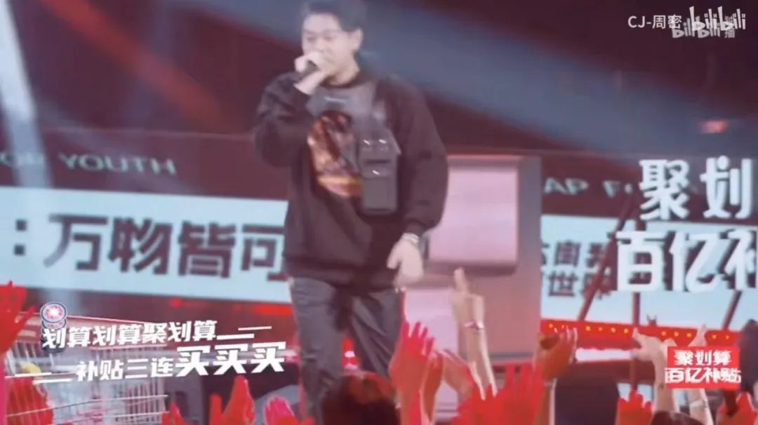其二,则是以定制或者赞助音乐综艺、大型晚会的形式,在冠名传播的基础上获得原创或创新改编。比如聚划算在赞助说唱节目《说唱新世代》后,节目选手周密、懒惰等为其打造了中插广告原创BGM、广告曲等,既有“划算划算聚划算”的Slogan,也有“完美的舞台需要实力支撑”等契合节目风格和品牌调性的歌词。