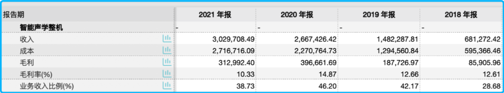 财报数据显示,2019年,歌尔股份总营收351.48亿元,同比增长47.99%。智能声学整机业务增长117.58%,营收规模在公司总营收中的占比由前一年的28.68%提升至42.17%,成为歌尔股份第一大收入来源。