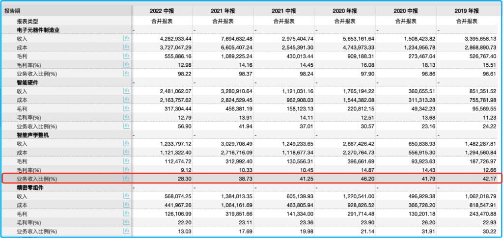 以本次“涉事”产品智能声学整机产品为例。今年上半年,智能声学整机产品营收123.38亿元,占歌尔股份总营收的28.30%。不过,该业务板块营收规模在公司总营收中的占比在近三年逐年下降。