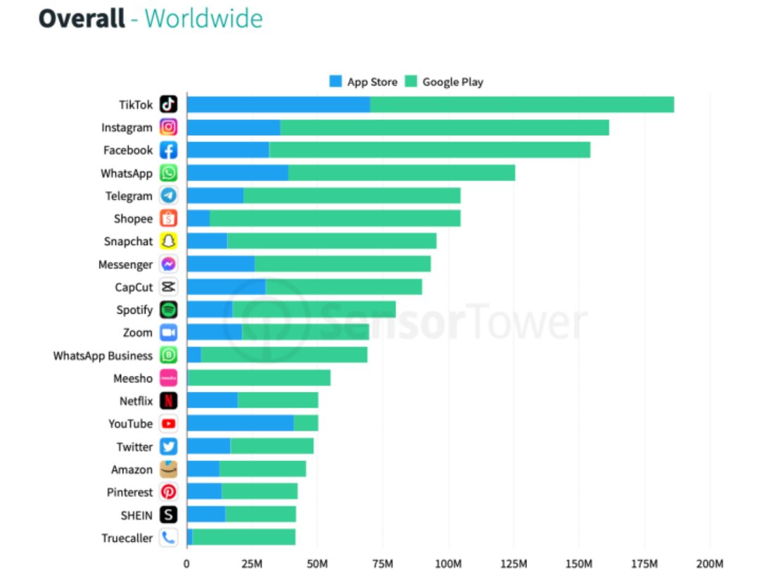 具体到美国市场,Tik Tok在App Store的下载量从2021年一季度开始长期霸占冠军宝座,今年也连续三个季度蝉联Google Play下载榜榜首,一季度安装量更是同比大涨19%。