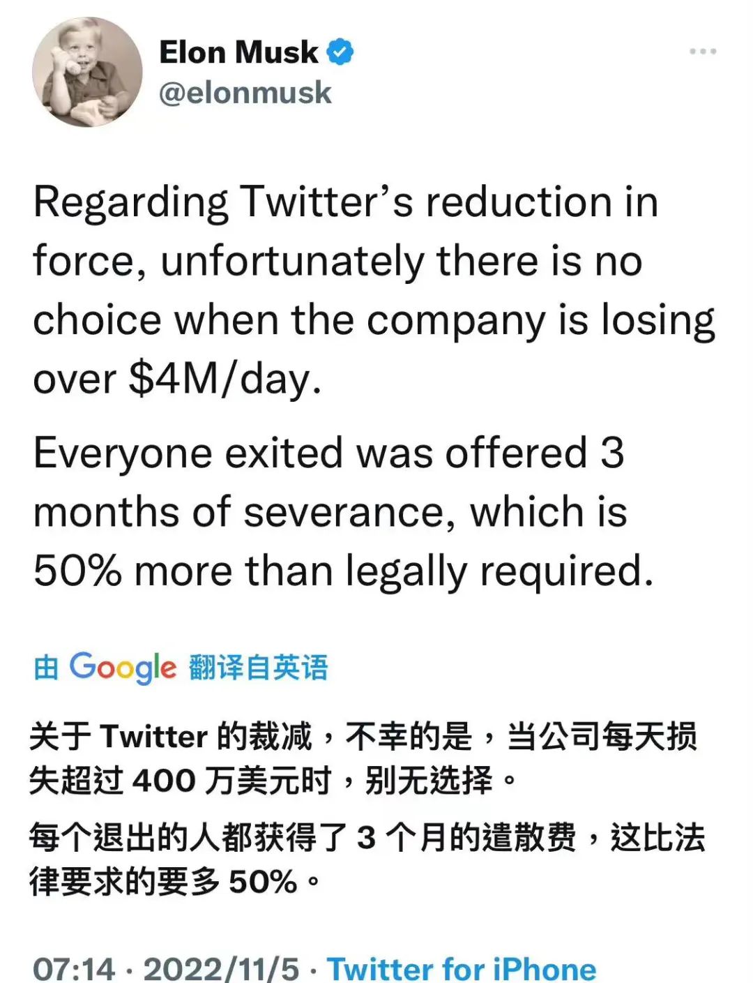 这只是马斯克新官上任放的好几把“火” 中的一个。尽管社会影响巨大,但从马斯克的角度,似乎也有不得不这么做的理由,“当公司每天亏损超过400万美元时,我们别无选择。”