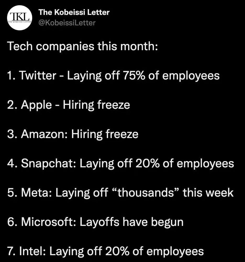就在昨日,Meta也宣布裁员13%,将近11000名员工。这是Meta成立18年以来的第一次大规模裁员。苹果、亚马逊等公司也宣布缩减招聘计划。寒意在席卷整个硅谷。