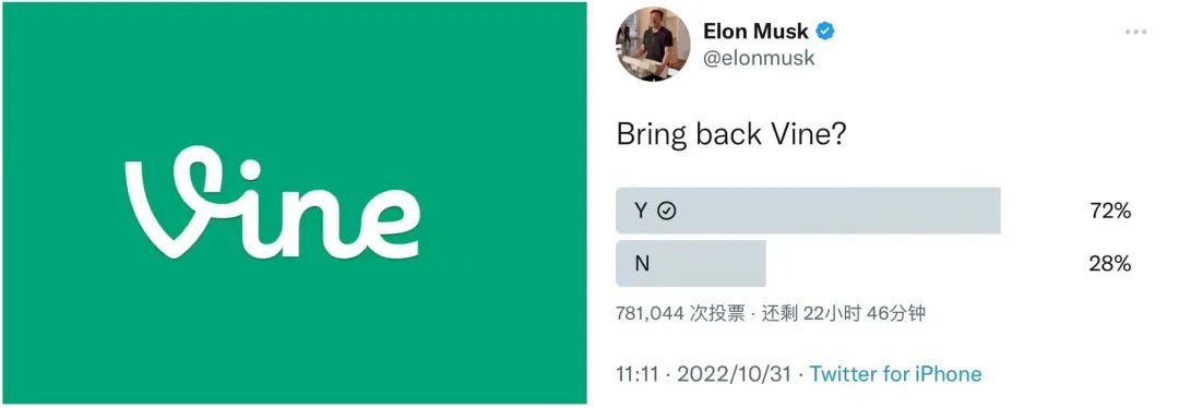 在收购完成的当天,马斯克就在Twitter发起了一次投票:复活Vine?