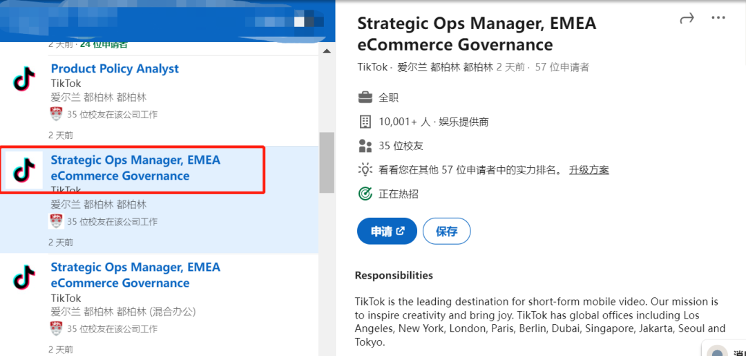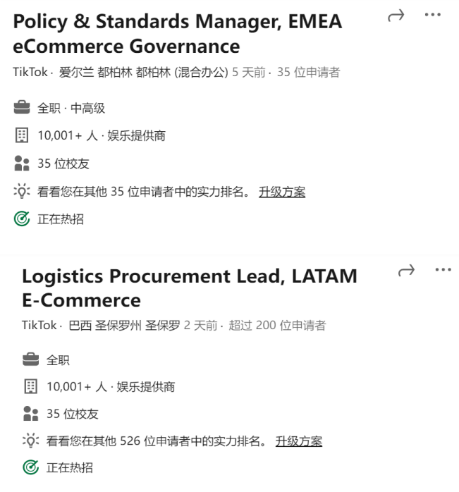 从 TikTok 在 LinkedIn 一周内发布的招聘信息来看,工作地位于爱尔兰都柏林与巴西圣保罗的热招岗位中的确有一些职位来自 TikTok 电商团队,这并不能完全证明 TikTok Shop 会在这 2 个市场上线,但可以看出 TikTok 电商业务已经在上述 2 个市场加快推进了。
