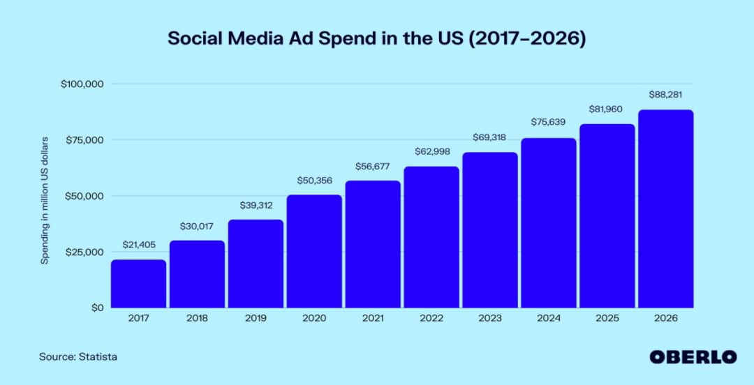 美国社媒广告花销变化(2017-2026),来源:Statista,制图:OBERLO