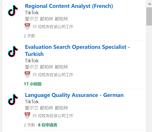 上世纪 90 年代,爱尔兰由于经济发展、居民生活质量高,树立起了口碑,吸引到不少来自欧洲大陆、美洲及亚洲的外国移民,这也让爱尔兰成了一个“全球化的国家”。从 TikTok 在爱尔兰热招的职位来看,都柏林的很多 TikTok 团队采用混合办公,且 TikTok 会在都柏林招聘精通法语、土耳其语、德语等各种小语种的员工。