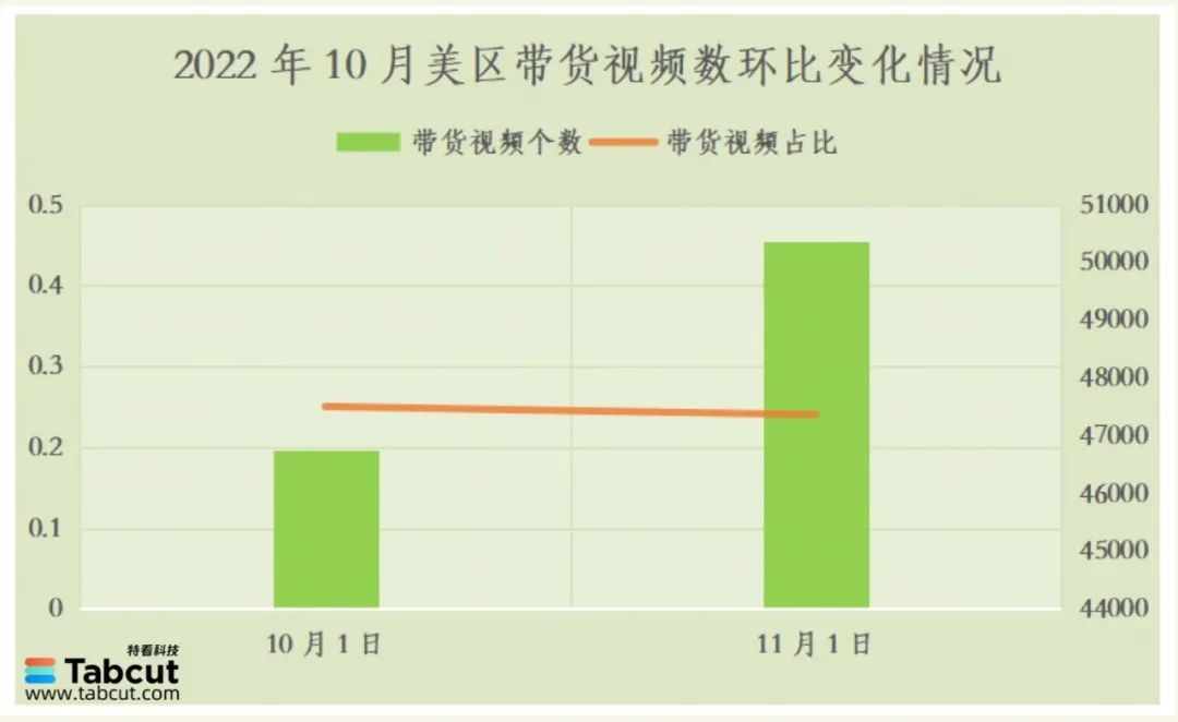 根据特看科技(一家基于数据+AI 驱动的内容智能公司)抓取的数据,10 月 1 日和 11 月 1 日这 2 天,他们在美区分别抓取到了 1816.06 万和 2038.92 万个视频,这其中的带货视频的数量分别是 4.67 万和 5.03 万,占比分别为 0.25% 和 0.24%。而印尼和英国市场的带货视频占比分别为 12.62% 和 4.03%。
