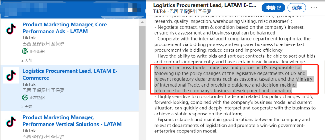 此外,TikTok 在巴西有关电商的招聘岗位中,物流采购主管一职属于全球物流团队,虽然工作地位于圣保罗,但要求应聘人员精通美国跨境贸易法律政策,及时跟进美国立法部门、海关、税务、国际贸易部等相关监管部门的政策变化。