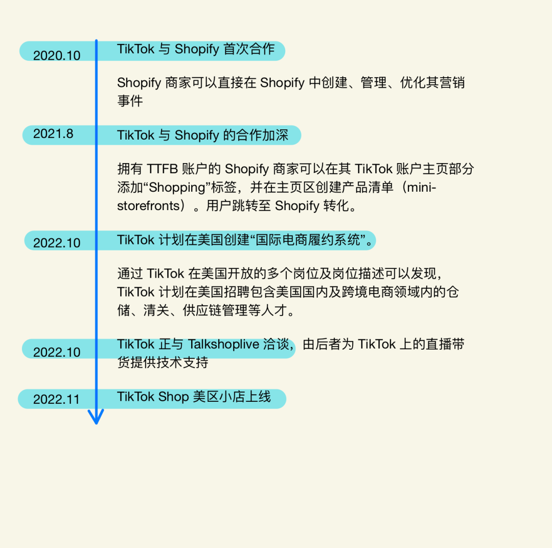 不同于已经上线小店一段时间的英国和东南亚,TikTok 在美国发展电商的路径要谨慎得多。下图笔者总结了部分 TikTok 在美国与电商相关的动作,从 2020 年 10 月开始到今年 11 月,TikTok 用了整整 2 年时间为美国卖家和用户习惯在平台内购物做铺垫。