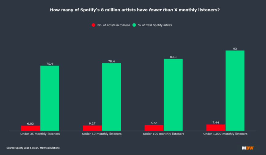 事实上,对于流媒体用户而言,其中绝大部分歌曲都不会被听到。数据显示,在Spotify上,截至2021年底,大约80%的歌曲每月听众不足50人,而每月听众少于50人的音乐人数量为630万。
