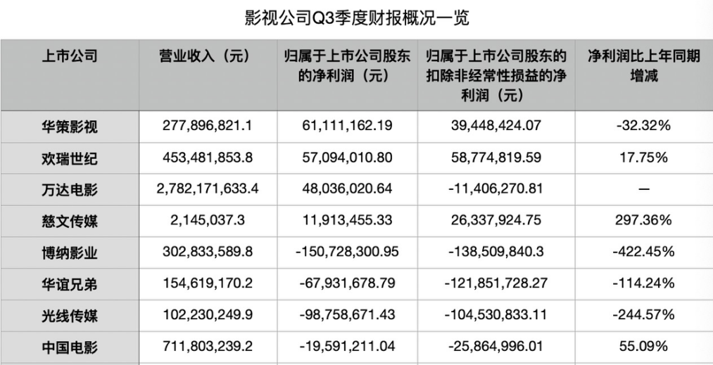 2022年第三季度财报已出,电影公司近乎全军覆没。连一直稳定盈利的优等生光线、刚上市的老大哥博纳都在亏——净利润呈负数。