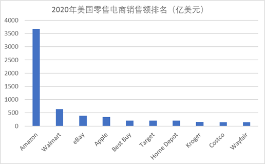 排名第二到第十名的平台基本上都是自营平台(仅有eBay一个例外),而且大部分是传统线下零售商的线上分支。2020年,苹果官方网店竟然能在美国零售电商市场排名第四,可见这个市场有多么零碎。