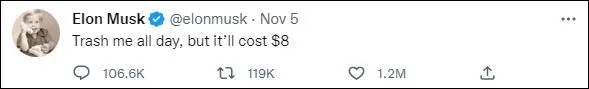 至于这第三把火,则要从本身的盈利机制下手。11月5日,推特正式推出全新订阅服务,每月收费8美元,以向用户提供蓝色认证标记(“蓝V”),该功能是在推特原有的对专业人士(如政治家、明星等)的蓝V认证以及推特的订阅功能“TwitterBlue”的结合体,能够提供给被认证者更多的权益。