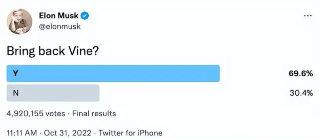 其次,则是复兴Vine平台。10月31日,马斯克特地在自己的Twitter上发布了一则投票调查,题目为“要不要带Vine回来?”,截至投票结束,共有492万名用户参与投票,其中有将近70%的用户表示同意。