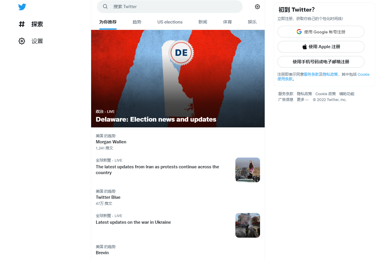 折腾完人,马斯克不忘初心,将目光投向了推特本身的功能与业务。才上任不到24小时,马斯克就将多年未变的推特主页——注册界面更换到流行趋势。现在,未注册账号的用户在打开推特主页时,会被重定向到显示热门推文和新闻故事的Explore页面,而此前则只显示一个注册表格。