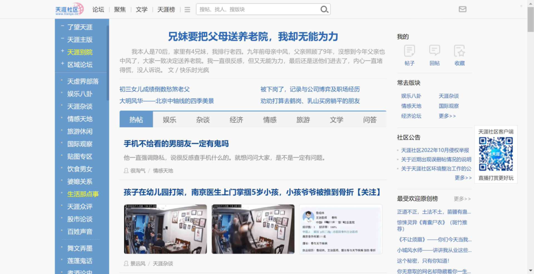 或许,这也与天涯社区的用户群体紧密相关。BBS、天涯陪伴了70后、80后的成长与青春,他们也是天涯社区的主力用户群体。伴随着时间的增长,他们大都开始迈入传统意义上的中年生活,工作、家庭、婚姻、孩子就是他们生活的组成部分。