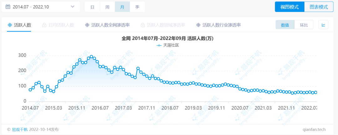 11月10日,燃次元在易观千帆看到,2022年9月,天涯社区APP的月活跃人数仅为59.52万。在记录时间内,从2014年7月至今,天涯社区APP的月活跃人数在2016年4月到达顶峰,为293.44万人,但此后持续下降,从2020年6月开始,月活跃人数已持续低于100万人。近一年时间,维持在55-63万之间。