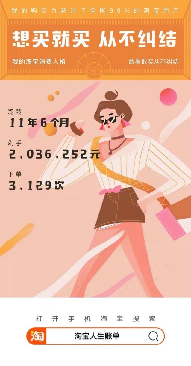迪迪在双11期间查看了自己的“淘宝人生账单”:淘龄11年6个月,剁手203.6252万元,下单3129次。购买能力超过了全国99%的用户,淘宝人格是“想买就买,从不纠结”。